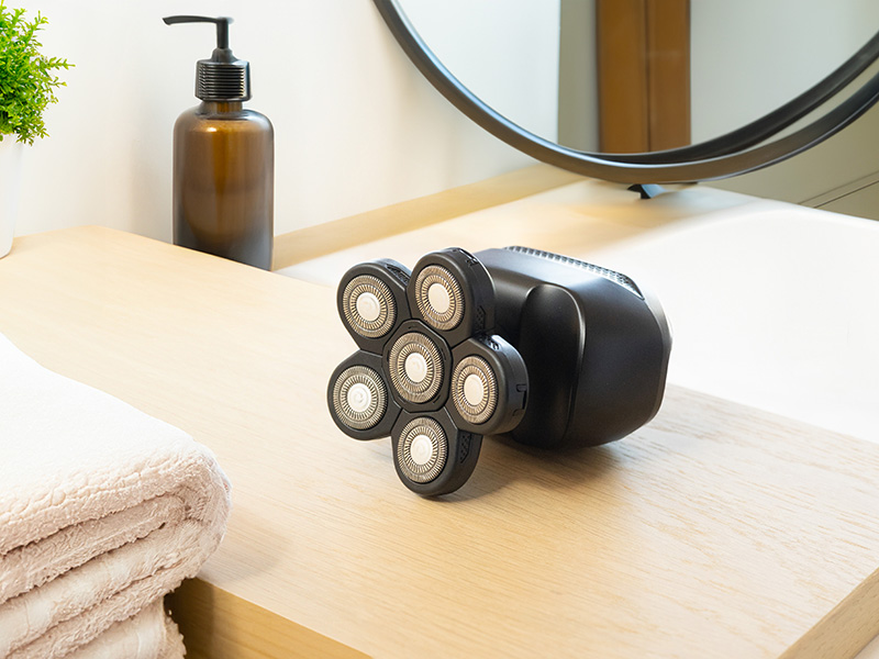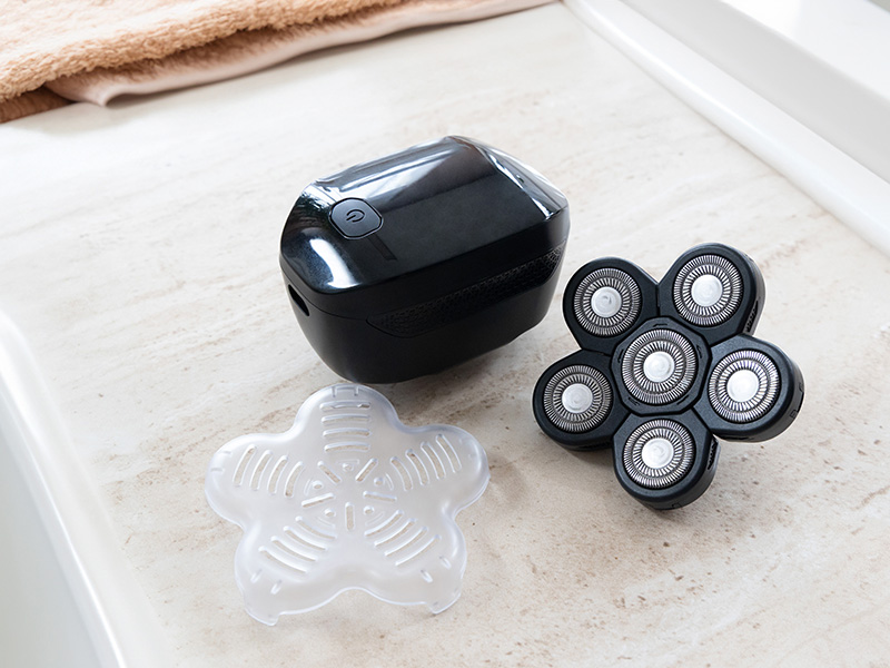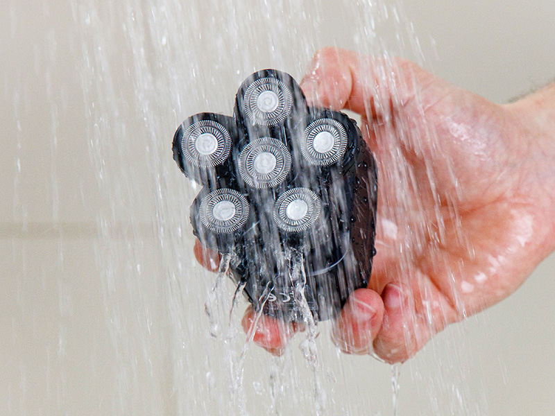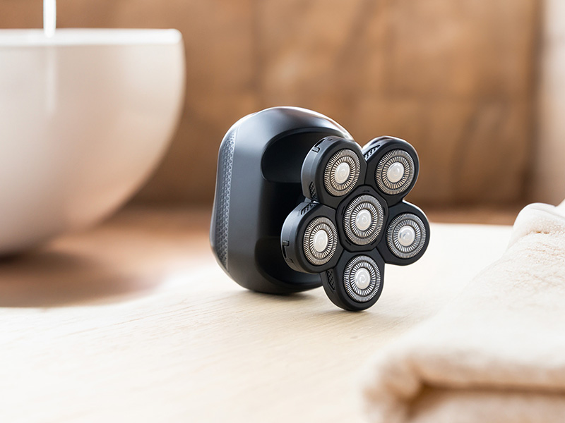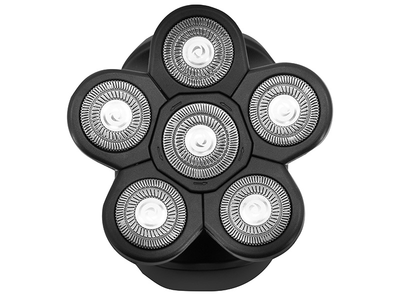 Golarka posiada sześć elastycznych głowic, które doskonale dopasowują się do kształtu głowy, zapewniając równomierne i precyzyjne golenie bez podrażnień.