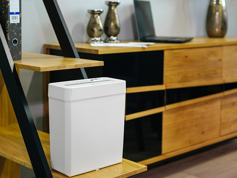Niszczarka Tracer White wyposażona jest w kosz na ścinki o pojemności 10 litrów, co pozwala na dłuższą pracę bez konieczności częstego opróżniania. To wystarczająca pojemność, by obsłużyć niszczenie codziennych dokumentów, a jednocześnie zapewnić wygodę użytkowania. Przezroczyste okienko w koszu pozwala łatwo kontrolować poziom zapełnienia, co zapobiega przypadkowemu przepełnieniu urządzenia.
