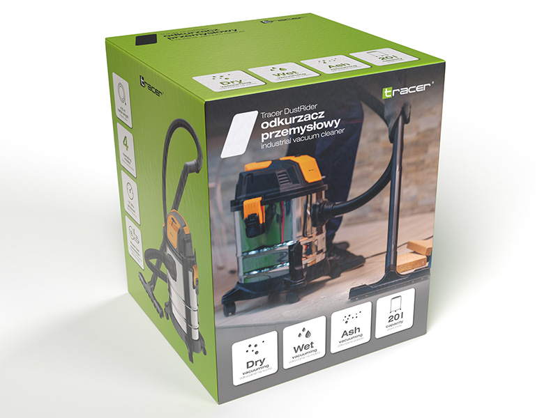 Tracer DustRider to wielofunkcyjny odkurzacz przemysłowy, który łączy wysoką moc, wszechstronność i łatwość użytkowania, czyniąc go niezbędnym narzędziem w każdym warsztacie, garażu czy miejscu pracy. Dzięki możliwości odkurzania na sucho i mokro, odkurzaniu popiołu oraz możliwości podłączenia elektronarzędzi, jest to niezawodne rozwiązanie do wymagających zadań czyszczących.