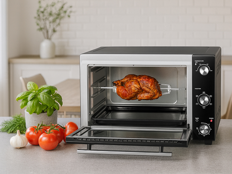 Mini piekarnik LAFE śmiało może śmiało konkurować z klasycznym sprzętem kuchennym. Dzięki funkcji termoobiegu, gorące powietrze rozprowadzane jest równomiernie w komorze urządzenia, opiekając potrawy dokładnie z każdej strony. Nie musisz się już obawiać o to, że apetycznie wyglądająca pieczeń okaże się surowa w środku – urządzeniu LAFE możesz zaufać. Chcesz przygotować wykwintną gęś na rodzinny obiad? Wykorzystaj do tego obrotowy rożen dołączony do piekarnika – opcja ta pozwoli Ci przygotować idealnie upieczone mięso w formie tradycyjnej, z rożna, a także z grilla.