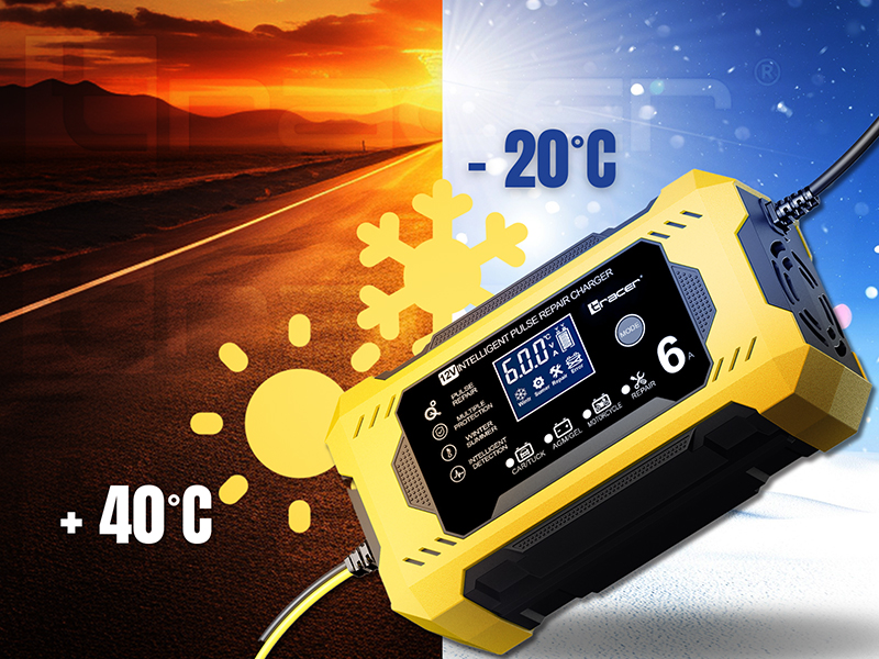 Prostownik Tracer DT126 potrafi automatycznie analizować temperaturę otoczenia i na tej podstawie regulować napięcie ładowania. Dzięki temu urządzenie działa optymalnie zarówno w upalne dni, jak i w mroźne poranki, zawsze dostosowując proces do aktualnych warunków. To inteligentne rozwiązanie gwarantuje maksymalną efektywność i pełną ochronę akumulatora.