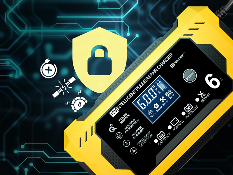Bezpieczeństwo użytkownika i akumulatora to priorytet. Prostownik Tracer DT126 został wyposażony w kompletny system zabezpieczeń, chroniący przed odwrotnym podłączeniem biegunów, zwarciem, przeciążeniem czy skokami napięcia. Dzięki temu możesz mieć pewność, że ładowanie przebiega w pełni bezpiecznie, a akumulator nie zostanie uszkodzony.