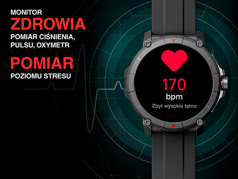 - Monitor zdrowia (pomiar ciśnienia, pulsu, oxymetr)