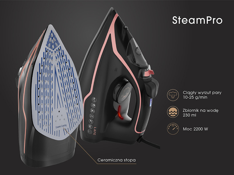 Lafe SteamPro to żelazko, które łączy wysoką wydajność z wygodą użytkowania, zapewniając doskonałe efekty prasowania każdego rodzaju tkanin. Dzięki nowoczesnym funkcjom i solidnej konstrukcji, prasowanie staje się szybsze, łatwiejsze i bardziej bezpieczne.