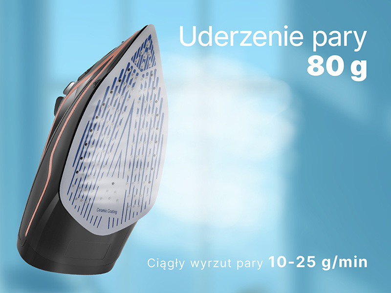 Dzięki mocy 2200 W żelazko szybko się nagrzewa i skutecznie usuwa zagniecenia, nawet z grubych materiałów. Ciągły wyrzut pary 10-25 g/min oraz uderzenie pary 80 g pozwalają na łatwe wygładzanie trudnych zagnieceń i prasowanie w pionie, np. firanek czy wiszących ubrań.
